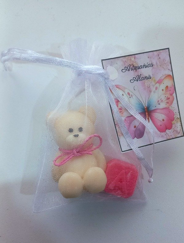 Lleva un osito de 3.5 x 5 cms de alto más un cubito con la inicial que prefieras.